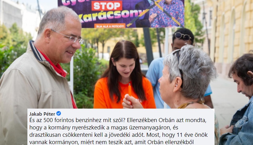És az 500 forintos benzinhez mit szól? Ellenzékben Orbán azt mondta, hogy a kormány nyerészkedik a magas üzemanyagáron, és drasztikusan csökkenteni kell a jövedéki adót. Most, hogy 11 éve önök vannak kormányon, miért nem teszik azt, amit Orbán ellenzékből mondott? Miért nem csökkentik drasztikusan a jövedéki adót? Miért nyerészkednek a magas benzináron? Jut eszembe, ha a Stop Márki-t aláírta már, esetleg aláírná a Stop benzináremelést is?