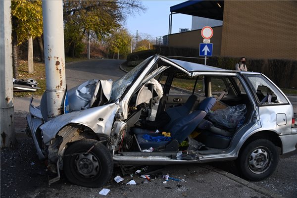 Villanyoszlopnak ütközött, összetört személygépkocsi a Soroksári úton 2021. november 15-én. A Tűzoltók a sérült sofőrt feszítővágóval szabadították ki a járműből.