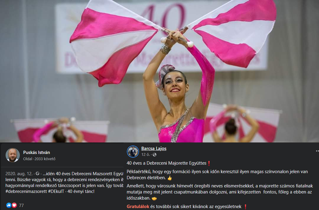 Debrecen hírnevét öregbíti neves elismerésekkel a 40 éves a Debreceni Majorette Együttes – tette közzé szombaton Barcsa Lajos, Debrecen alpolgármestere.A nívódíjas együttest Dr. Tóthné Rozsályi Judit alapította 1980-ban. Az együttes az idők során nagyon népszerű lett. A Debreceni Virágkarneválnak is visszatérő fellépői.