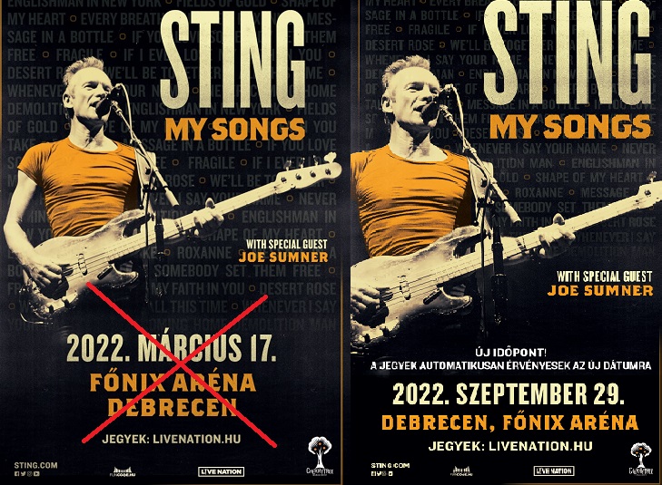 A jelenleg még fennálló nemzetközi egészségügyi korlátozások miatt Sting My Songs turnéjának március 7-21. közötti fellépései 2022 őszére kerülnek át – közölték a szervezők.