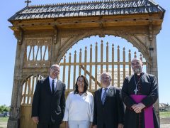 Novák Katalin köztársasági elnök (j5), Balog Zoltán püspök, a Magyarországi Református Egyház zsinatának lelkészi elnöke (j4), Kató Béla, az Erdélyi Református Egyházkerület püspöke (j3), Cseri Miklós főigazgató (b5), Schanda Tamás, az államfő kabinetfőnöke (b4), Fekete Péter, az Emberi Erőforrások Minisztériumának kultúráért felelős államtitkára (b3), Vitályos Eszter, az Emberi Erőforrások Minisztériumának államtitkára, a térség fideszes országgyűlési képviselője (b2) és Hoppál Péter, Pécs és térsége fideszes országgyűlési képviselője, az Országgyűlés kulturális bizottságának alenöke (b) a szentendrei Szabadtéri Néprajzi Múzeum Erdély épületegyüttesének első kiállítási egysége ünnepélyes megnyitóján 2022. május 19-én. MTI/Szigetváry Zsolt