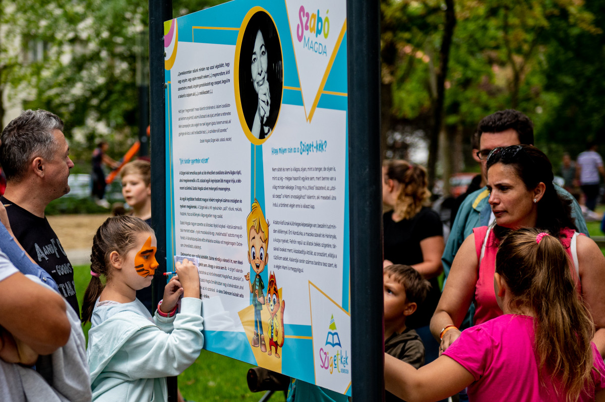 A játszótér Szabó Magda Sziget-kék című meseregényének tematikája mentén került kialakításra az írónő Debrecenhez való kötődése, a hagyományok ápolása és a cívis értékek iránti tiszteletből. Szabó Magda ezen műve az állatok és az emberek kapcsolatáról, barátságáról és a természet értékeiről szól. Debrecen önkormányzatának kiemelt célja a környezet védelme, a Nagyerdő különlegességének megőrzése, amely a regény üzenetével összhangban áll. A 11 szereplő szobra megjelenik a parkban, a kihelyezett táblák és QR-kódok segítségével pedig további érdekességeket lehet róluk olvasni.