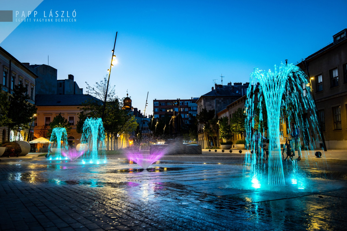 “Fény és víz játéka a belváros szívében” – ezzel a címmel osztott meg bő egytucatnyi friss fotót Debrecenről Papp László.