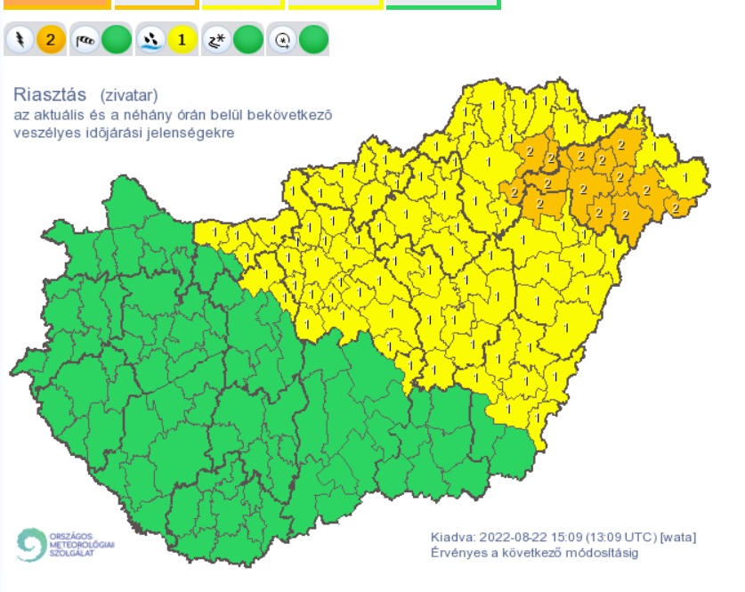 Zivatarveszély miatt másodfokú riasztásokat adott ki több északkeleti járásra az Országos Meteorológiai Szolgálat hétfőn kora délután.