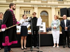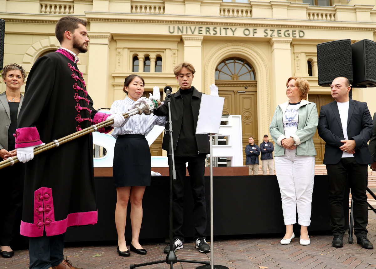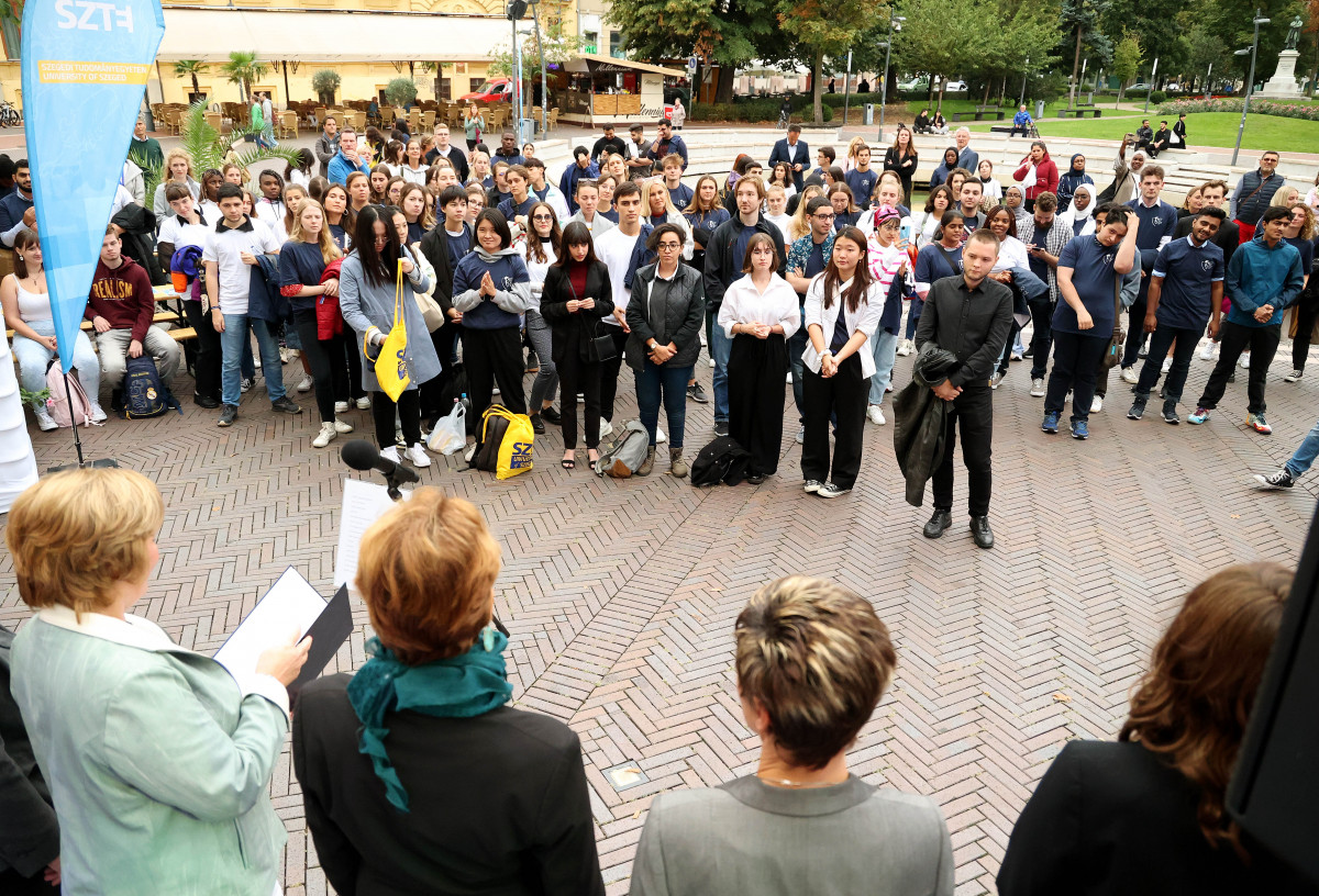 A nemzetközi gólyákat augusztus 31. és szeptember 2. között háromnapos rendezvénysorozattal várta az intézmény, ennek zárása péntek délután a hallgatók gólyaesküje volt a Dugonics téri Rektori Hivatal előtt.