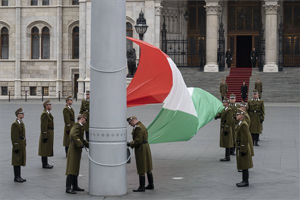 Fotó: Novák Katalin köztársasági elnök (k) jelenlétében katonai tiszteletadással felvonják, majd félárbócra engedik a nemzeti lobogót az Országház előtti Kossuth Lajos téren az 1956-os forradalom és szabadságharc leverésének 66. évfordulóján, a nemzeti gyásznapon, 2022. november 4-én. Az államfő mellett Ruszin-Szendi Romulusz altábornagy, a Magyar Honvédség parancsnoka (b) és Kun Szabó István, a köztársasági elnök főhadsegédje (j). MTI/Szigetváry Zsolt
