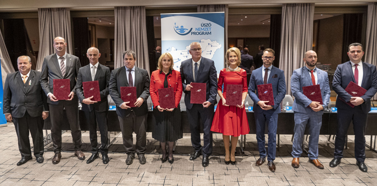 A nyitóképen Sós Csaba szövetségi kapitány, Sterbenz Tamás, a Magyar Testnevelési és Sporttudományi Egyetem rektora, Pető Károly, a Debreceni Egyetem rektorhelyettese, Hamar Imre, Eötvös Loránd Tudományegyetem rektorhelyettese, Gellén Klára, a Szegedi Tudományegyetem rektorhelyettese, Wladár Sándor a Magyar Úszó Szövetség (MÚSZ) elnöke, Lukács Eszter, a Széchenyi István Egyetem nemzetközi stratégiai elnökhelyettese, Jakab Ferenc, a Pécsi Tudományegyetem rektorhelyettese, János István, a Nyíregyházi Egyetem rektorhelyettese és Váczy Kálmán Zoltán, az Eszterházy Károly Katolikus Egyetem rektorhelyettese (b-j). Fotó: MTI/Szigetváry Zsolt