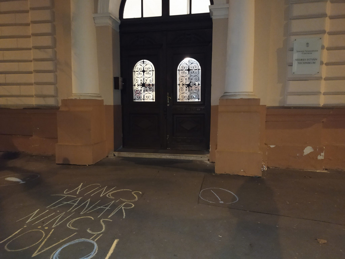 Több tucat szegedi iskola elé rajzolt krétával tiltakozó feliratokat héfőre virradóra a frissen alakult Egységes Szülői Front – Szeged. A Deák Ferenc Gimnázium huszonhárom tanára ma reggel nem vette fel a fel munkát.