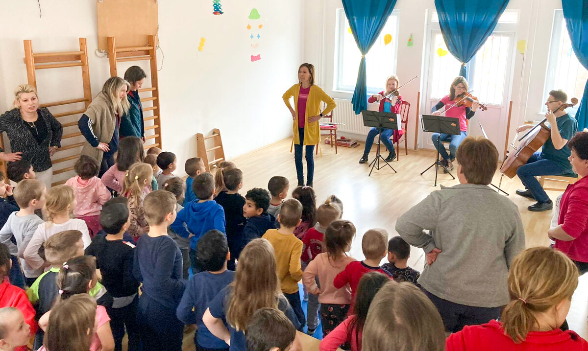Az óvodások a dalok mellett közelről is megismerkedhettek a fuvolával, a brácsával, a hegedűvel és a csellóval is.