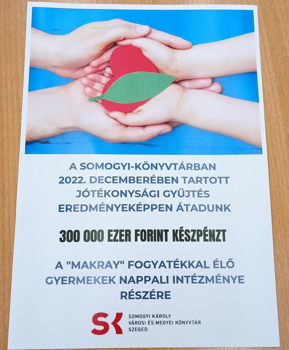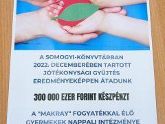 A könyvtár célja, hogy támogassa ezt az intézményt, a cél eléréshez pedig mindenki hozzájárulhatott, aki december 1. és 17. között adományért cserébe könyvet választott magának a Somogyi-könyvtár Dóm téri épületének alagsorában elhelyezett készletből. Az összegyűlt 300 ezer forintot a Makray vezetője, Hódi-Forrai Éva vette át, aki elmondta, gyógytornára és gyógymasszázsra fordítják majd az összeget, amely nagyon sokat lendít az intézmény fiataljainak jó közérzetén.