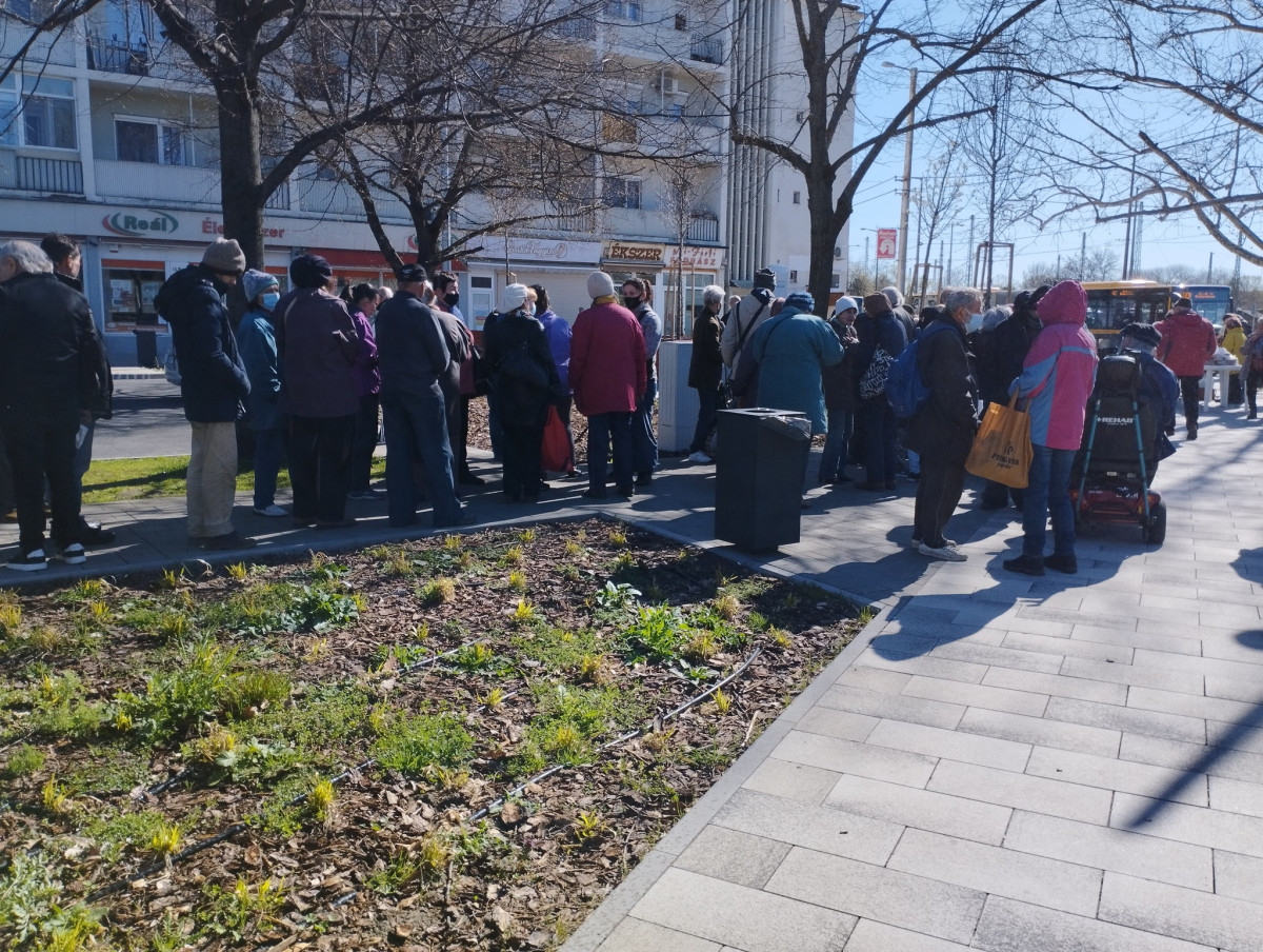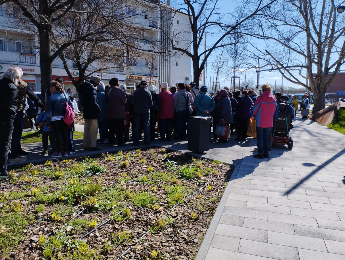 Már jóval az ételosztás kezdete előtt gyülekeztek az ételre várók. Zömmel kisnyugdíjasok, de jöttek olyanok is, akik életét a Holdról is látható óriási infláció roppantotta meg. Vendégeink többsége – elmondásuk szerint – jóval havi 120 ezer forint alatti nyugdíjból próbál nem éhen halni.