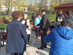 Papp László polgármester 100 tő földieper-palántát, dughagymát, és több csomag vegyes (retek, saláta, cékla) vetőmagot adott át a lakótelepen élő kertészkedők részére 2023. április 12-én.