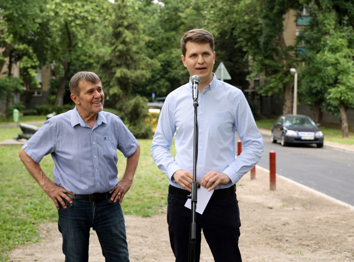 Mihálik Edvin, a körzet önkormányzati képviselője és Nagy Bandó András humorista csütörtökön átadta a felújított újszegedi Kockaház utcát.