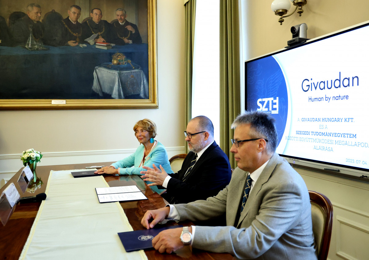 A megállapodást Dr. Fendler Judit, az SZTE kancellárja, Prof. Dr. Kónya Zoltán, az egyetem tudományos és innovációs rektorhelyettese, valamint a Givaudan részéről Karkas Mihály, gyárigazgató és ügyvezető látták el kézjegyükkel.
