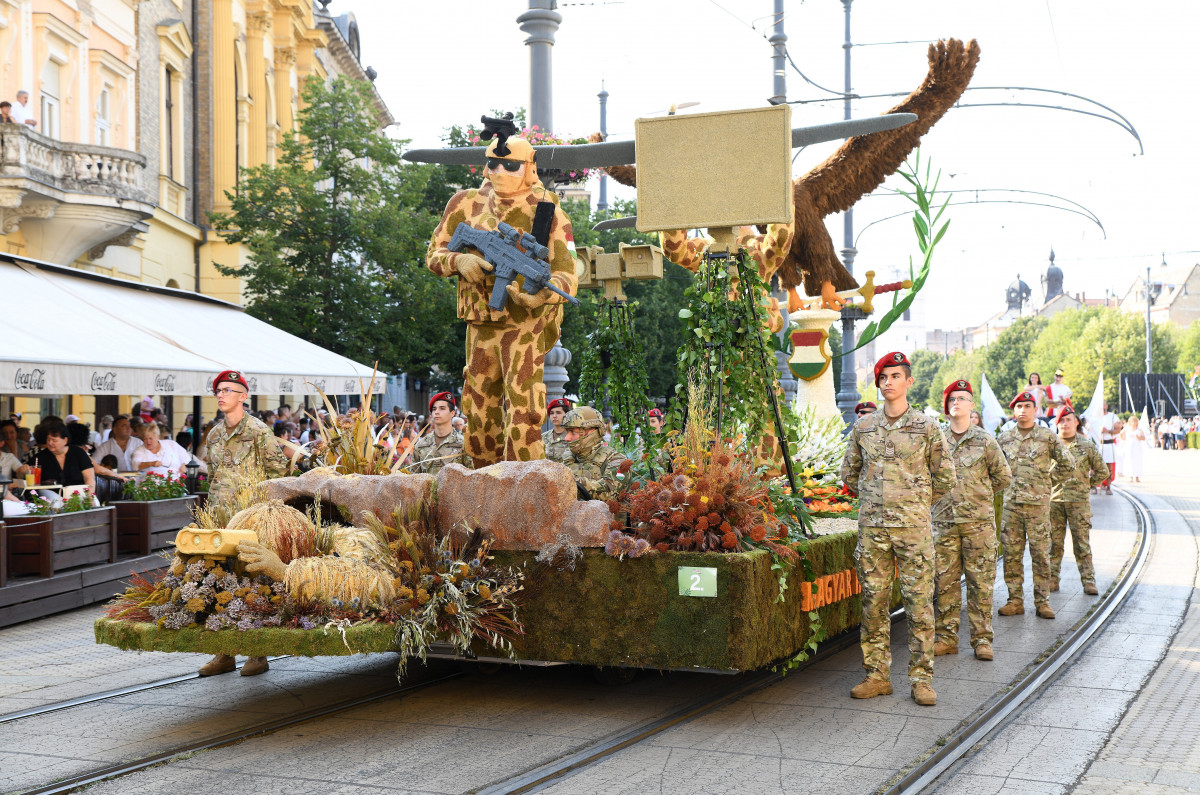 A Magyar Honvédség kompozíciója a debreceni virágkarneválon 2023. augusztus 20-án. MTI/Balázs Attila