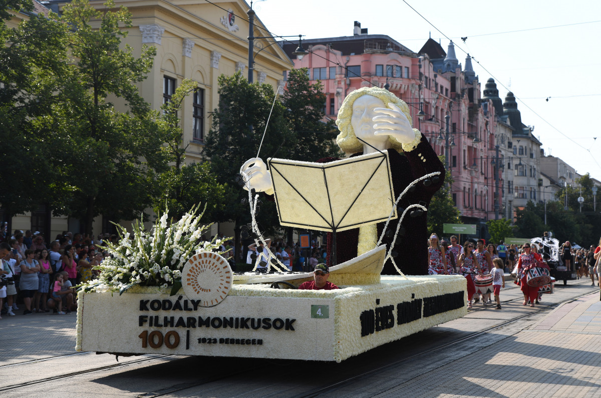 A Kodály Filharmonikusok kompozíciója a debreceni virágkarneválon 2023. augusztus 20-án. MTI/Balázs Attila