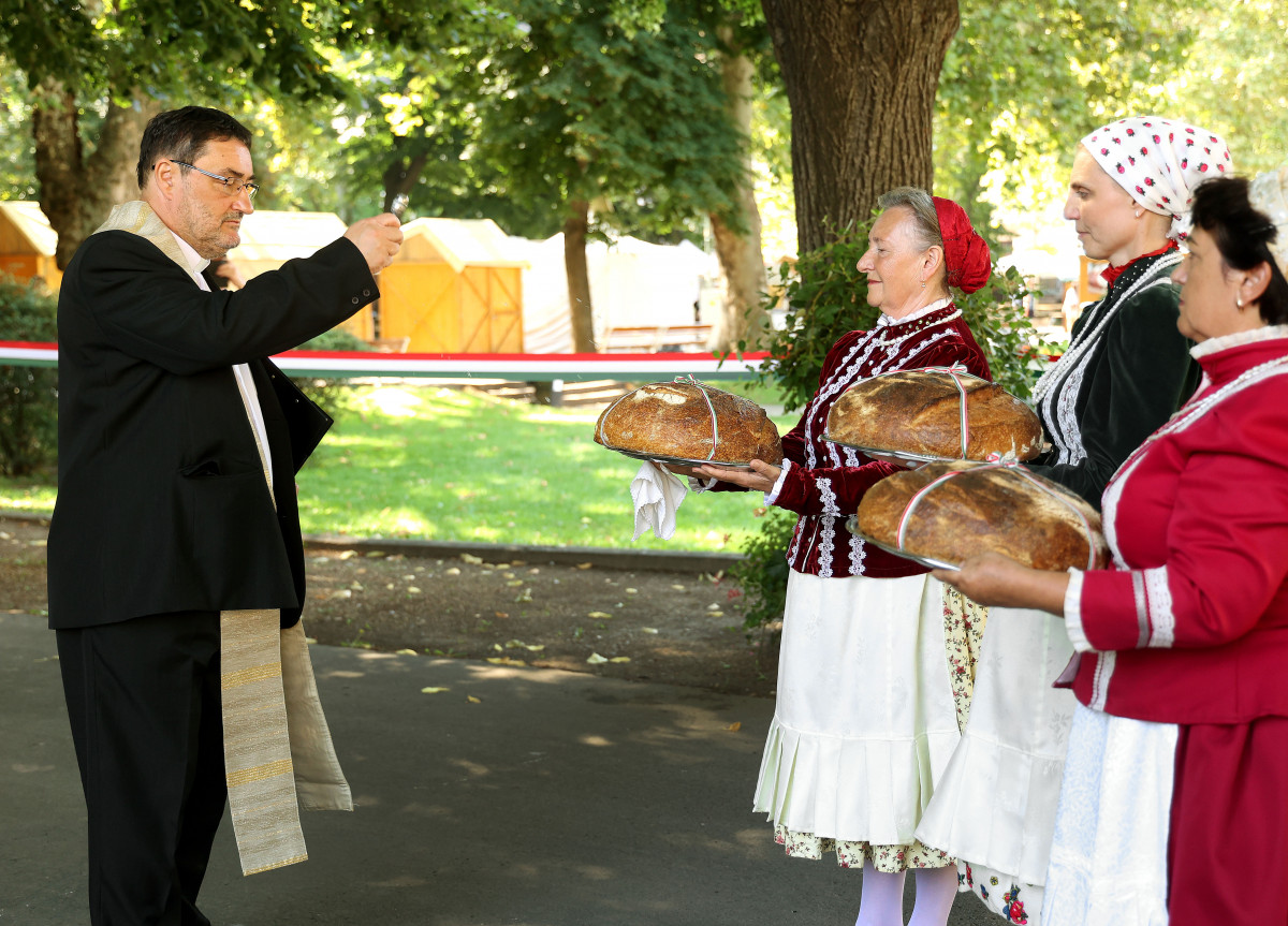 A magyarországi és határon túli gazdák által összeadott búzából sütött Magyarok Kenyerét felvágták és megkínálták belőle a kilátogatókat.