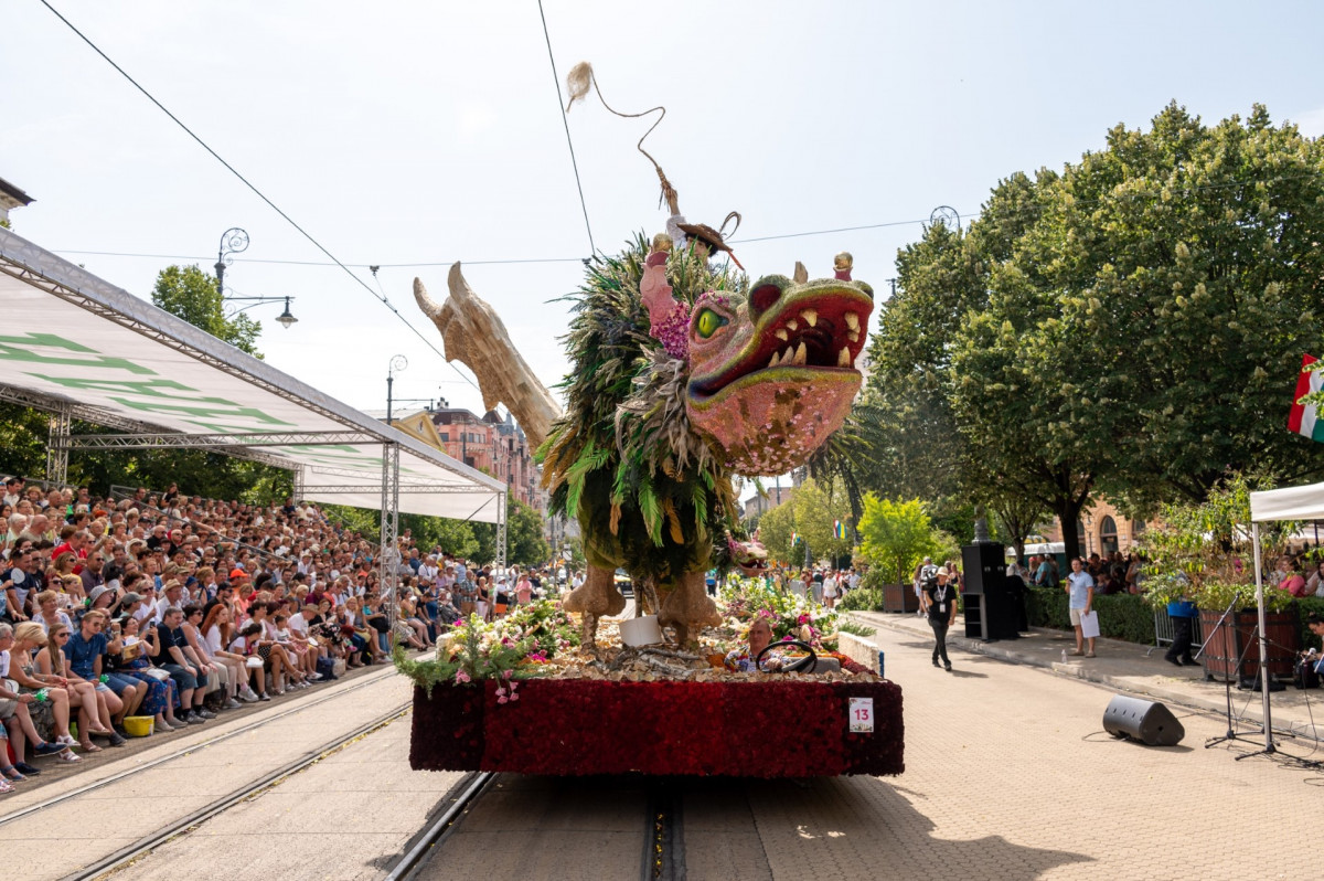 Külföldi és magyar művészeti csoportok 1500+ táncosa kápráztatja el a közönséget a virágkocsikkal.