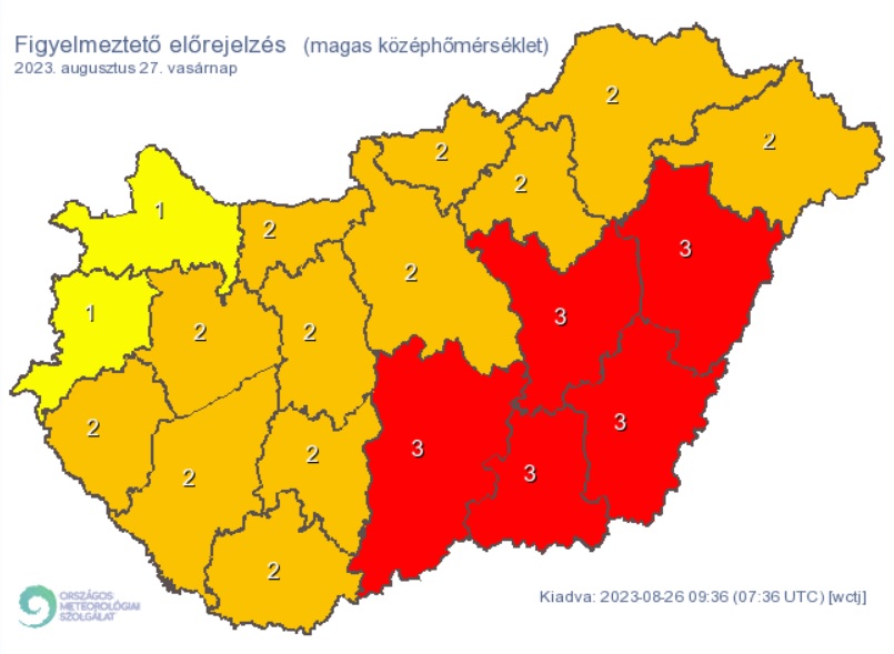 A meteorológiai szolgálat a veszélyjelzésében azt írta, a két déli vármegyére a legmagasabb, piros fokozatú figyelmeztetést adta ki magas középhőmérséklet miatt hétfőre. Bács-Kiskun, Pest, Jász-Nagykun-Szolnok, Hajdú-Bihar és Szabolcs-Szatmár-Bereg vármegyére másodfokú (narancs) figyelmeztetés van érvényben a magas középhőmérséklet miatt hétfőre, ezeken a területeken várhatóan 27 fok felett alakul a középhőmérséklet. Az előrejelzés szerint vasárnap a középhőmérséklet általában 26-28 fok, az Alföldön, a Dunántúl keleti, délkeleti részén és városi környezetben 29 fok körül várható. Baranya, Bács-Kiskun, Békés, Csongrád-Csanád, Hajdú-Bihar, Jász-Nagykun-Szolnok, Pest és Tolna vármegye területén a legmagasabb, harmadfokú (piros) figyelmeztetés van érvényben, ott várhatóan 29 Celsius-fok felett alakul a középhőmérséklet.