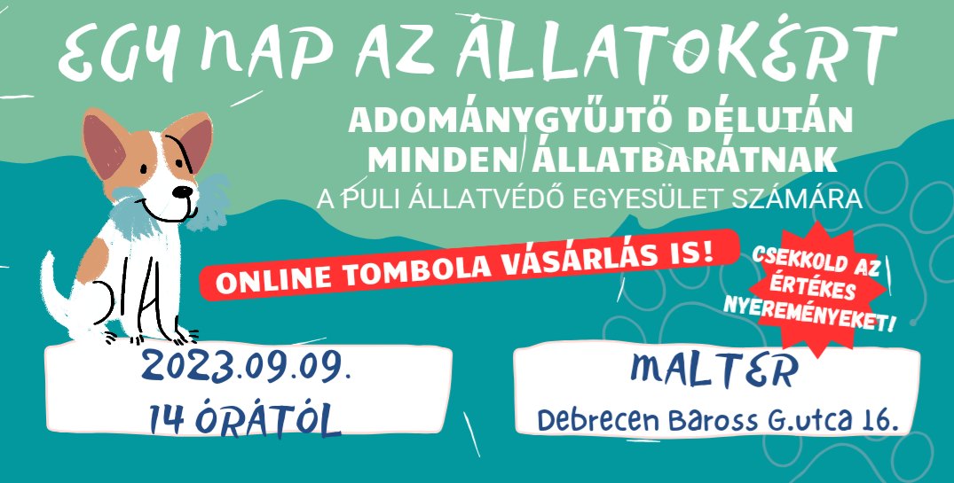 2023. szeptember 9-én Debrecenben, a Malterben (Baross Gábor utca 16.) egy izgalmas programokkal, adománygyűjtő teli délutánra várja az állatbarátokat a Civilek az állatokért baráti csoport. A vendégek a “jó tett helyében jót várj” karmikus üzenet jegyében értékes nyereményekkel és ajándékokkal térhetnek haza. Az adományokat a Puli Állatvédő Egyesület számára gyűjtik, a délután folyamán a látogatók megismerkedhetnek az egyesület tevékenységével és a menhely kis lakóival.