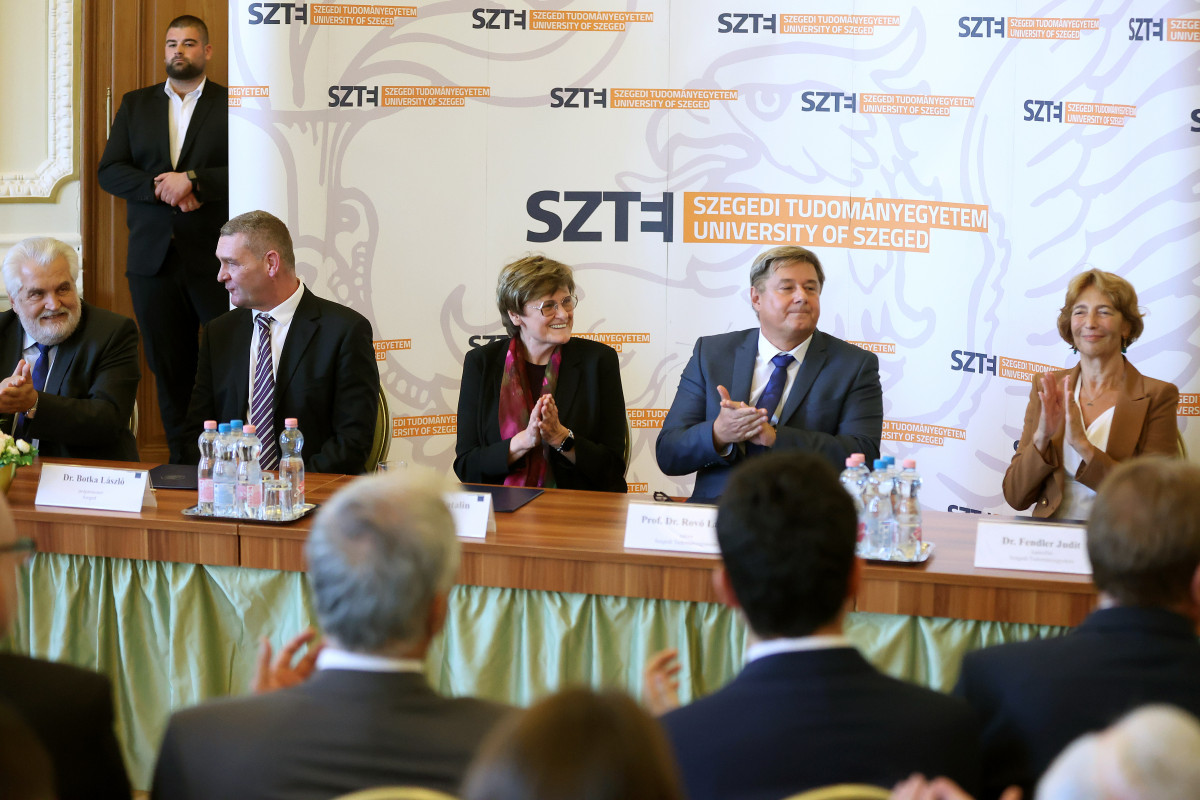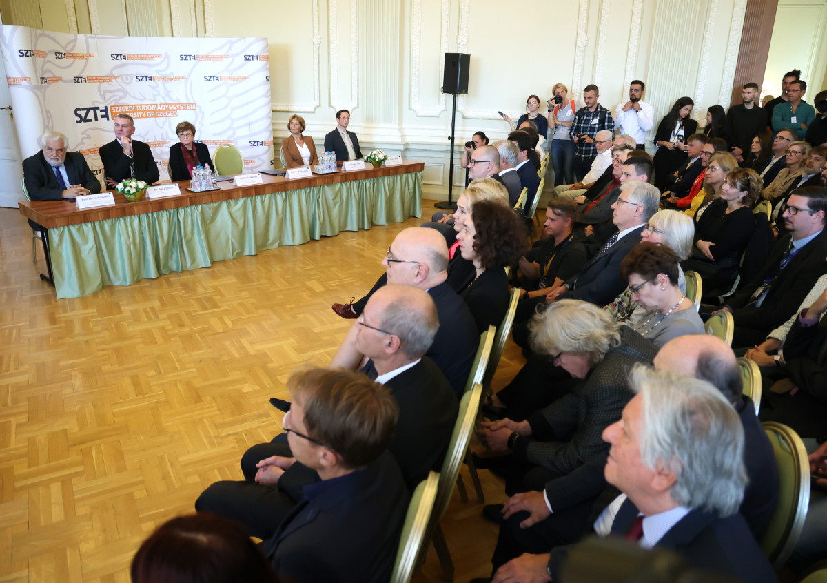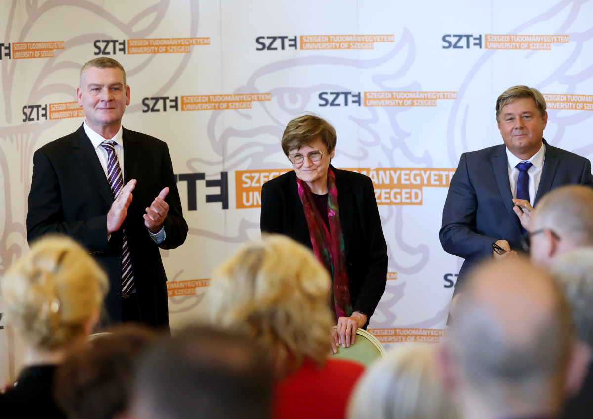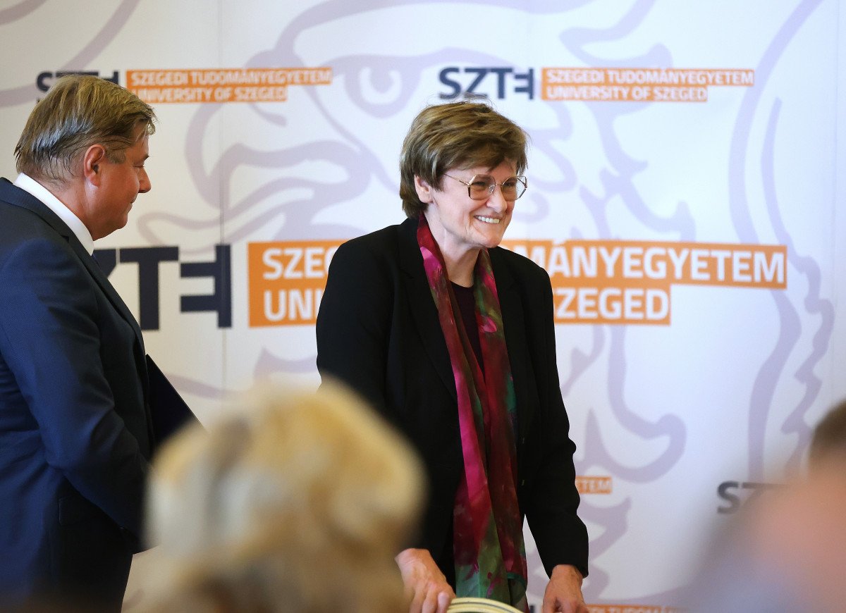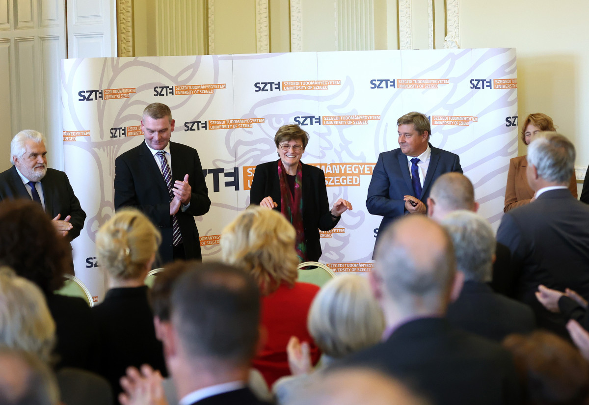 A Dugonics téri épületben 14 órakor ünnepi ülés kezdődött Dr. Karikó Katalin tiszteletére. A rektori hivatal dísztermében a meghívott vendégek felállva, vastapssal köszöntötték a tudóst.