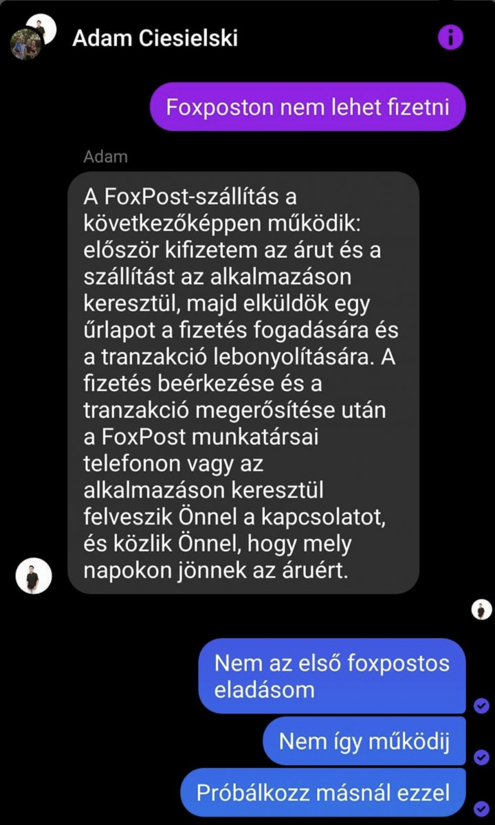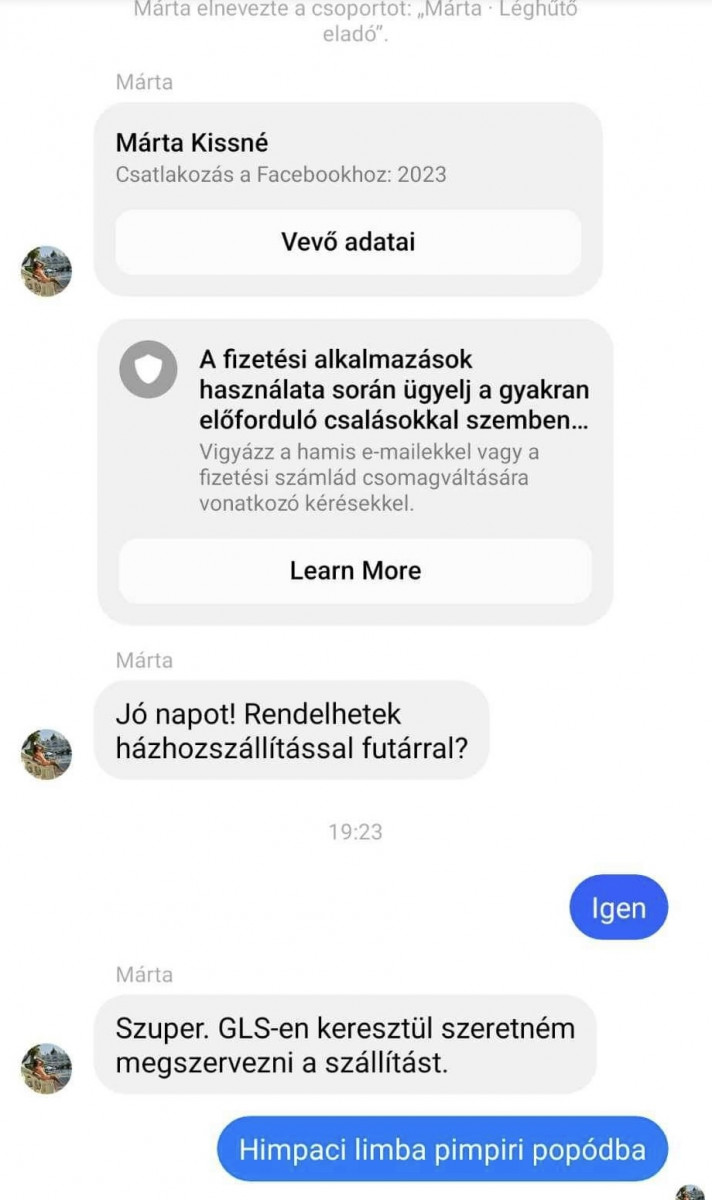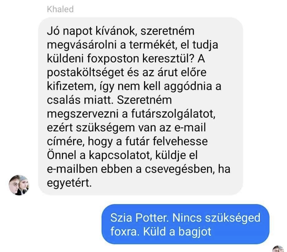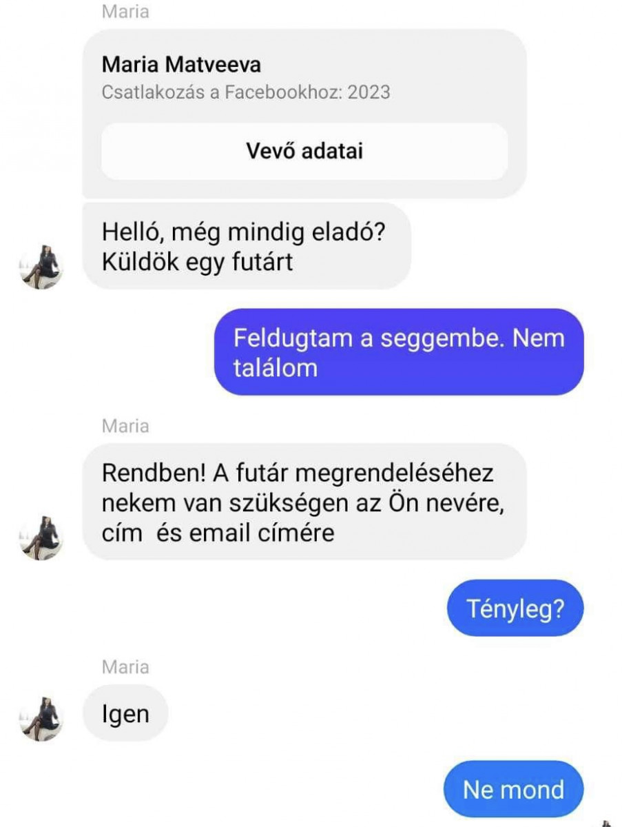 Nézzük át alaposan az eladó vagy vevő profilját. Gyanús lehet a külföldi név, a feltűnően kevés ismerős, és az is, hogy nincs egyetlen egy posztja sem. A vele zajló beszélgetések buták, oda nem illő, hitegető válaszokat ad, vagy éppen foglalót kér, az adott termékre. Ha pedig valami nem kóser, akkor teszteljük le egy egyszerű kérdéssel. Például: Mikor uralkodott Mátyás király? És ha azt válaszolja, hogy „ez remek”, „ez így rendben van”, akkor nagyon gyorsan tiltsuk le.