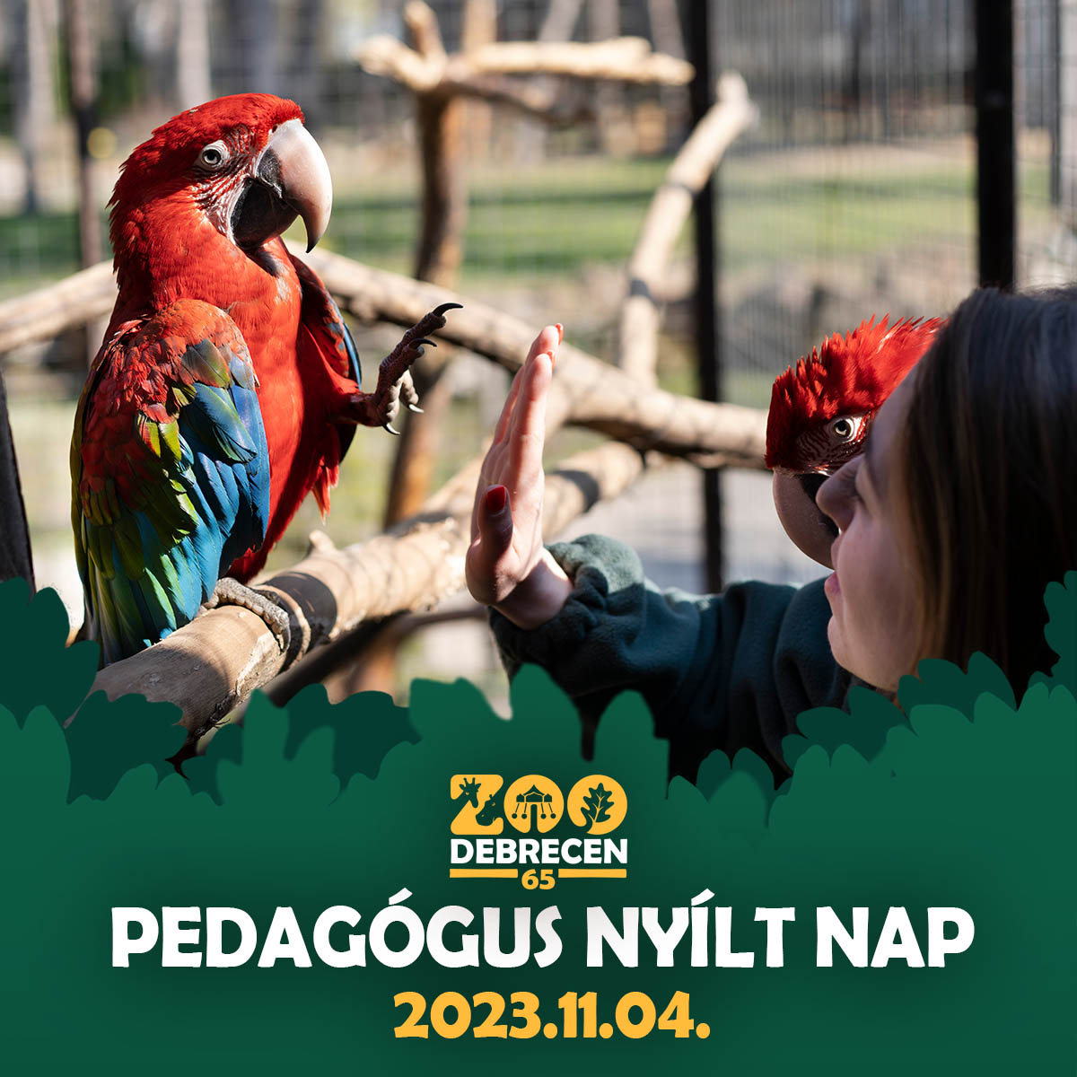 A ZOO Debrecen 2023 november 4-ére, díjmentes belépéssel és interaktív előadással várja azon pedagógusokat, akik érdeklődnek az állatkert operatív zoopedagógiai és élménypedagógiai munkája iránt. A nyílt nap célja, hogy a résztvevő pedagógusok megismerhessék az intézmény napi pedagógiai tevékenységeinek sokszínűségét. A délelőttre és délutánra meghirdetett gyakorlati foglalkozásokon az állatkert működését, az intézmény pedagógiai munkájának változatosságát mutatják be, különös tekintettel a természetvédelemre, a környezetvédelemre, a felelős állattartásra és az élő állatok fizikai és mentális jótékony hatásaira.