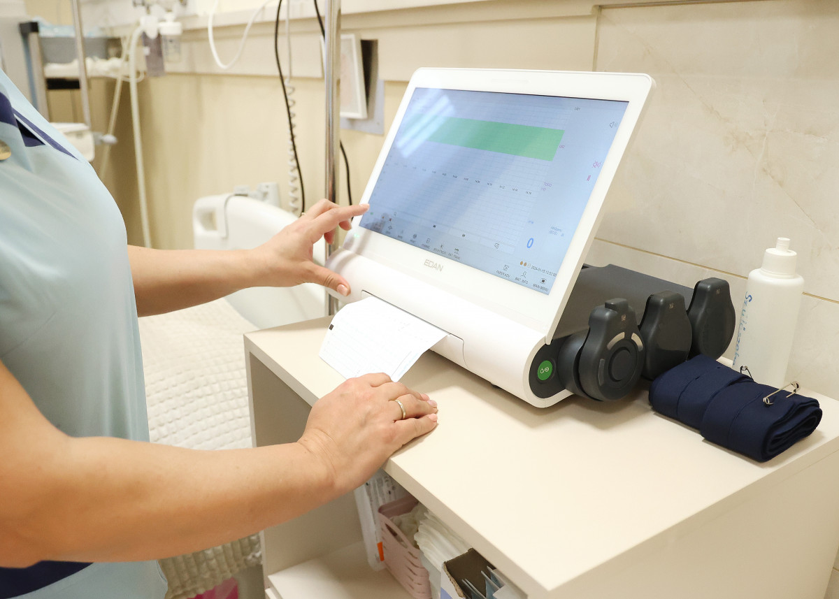 A szobában egy a magzati szívhang és a méhtevékenység együttes vizsgálatára alkalmas mobil CTG berendezés is helyett kapott. Ez abban különbözik a hagyományos eszközöktől, hogy a kismama hasára helyezhető – vízálló – érzékelők vezeték nélkül továbbítják az adatokat, így a szülő nő szabadabban mozoghat, akár a kádban vagy a zuhany alatt is vizsgálható – közölte az orvos.