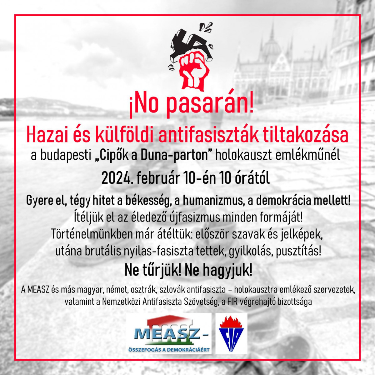Ezért is szervezi meg 2024. február 10-én 10 órától a Duna-parti cipők holokauszt emlékműnél a nemzetközi antifasiszta tiltakozást, amelyre várjuk a valódi antifasiszták érdeklődését.