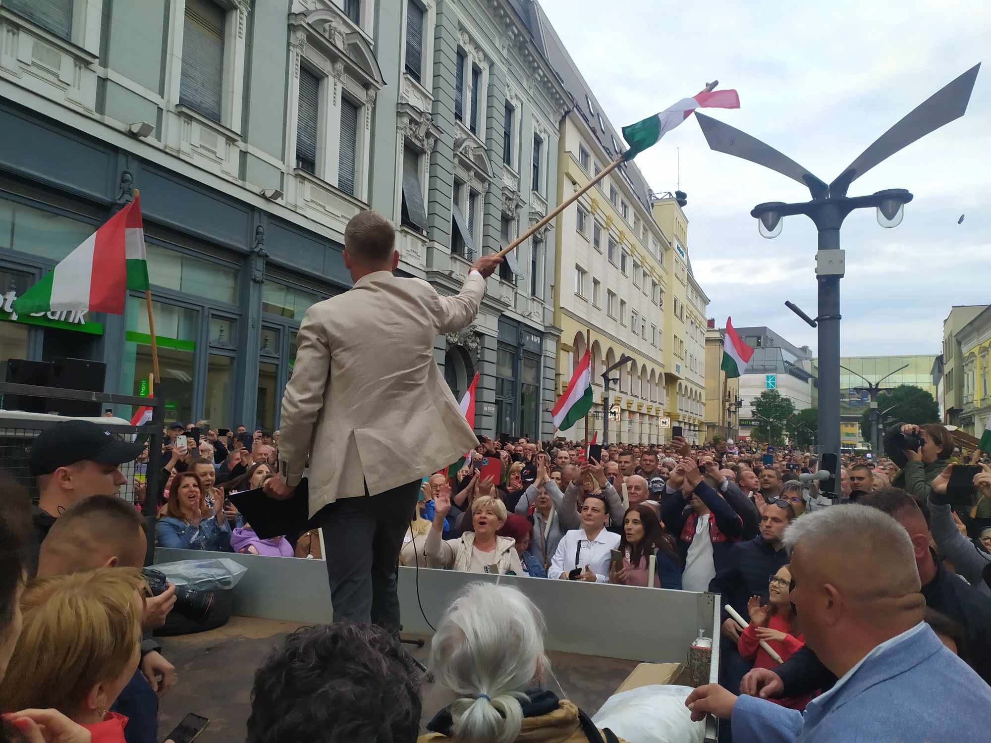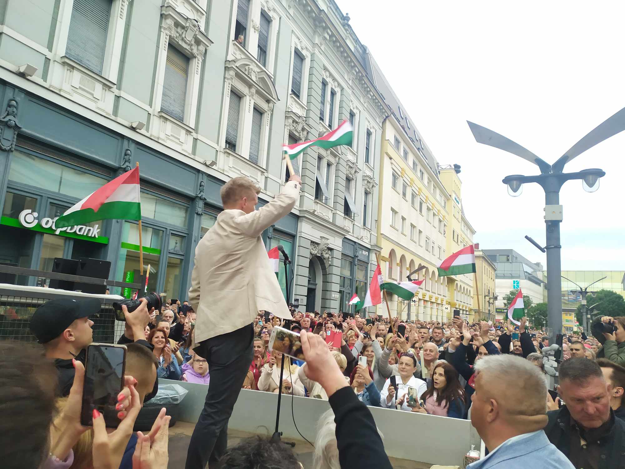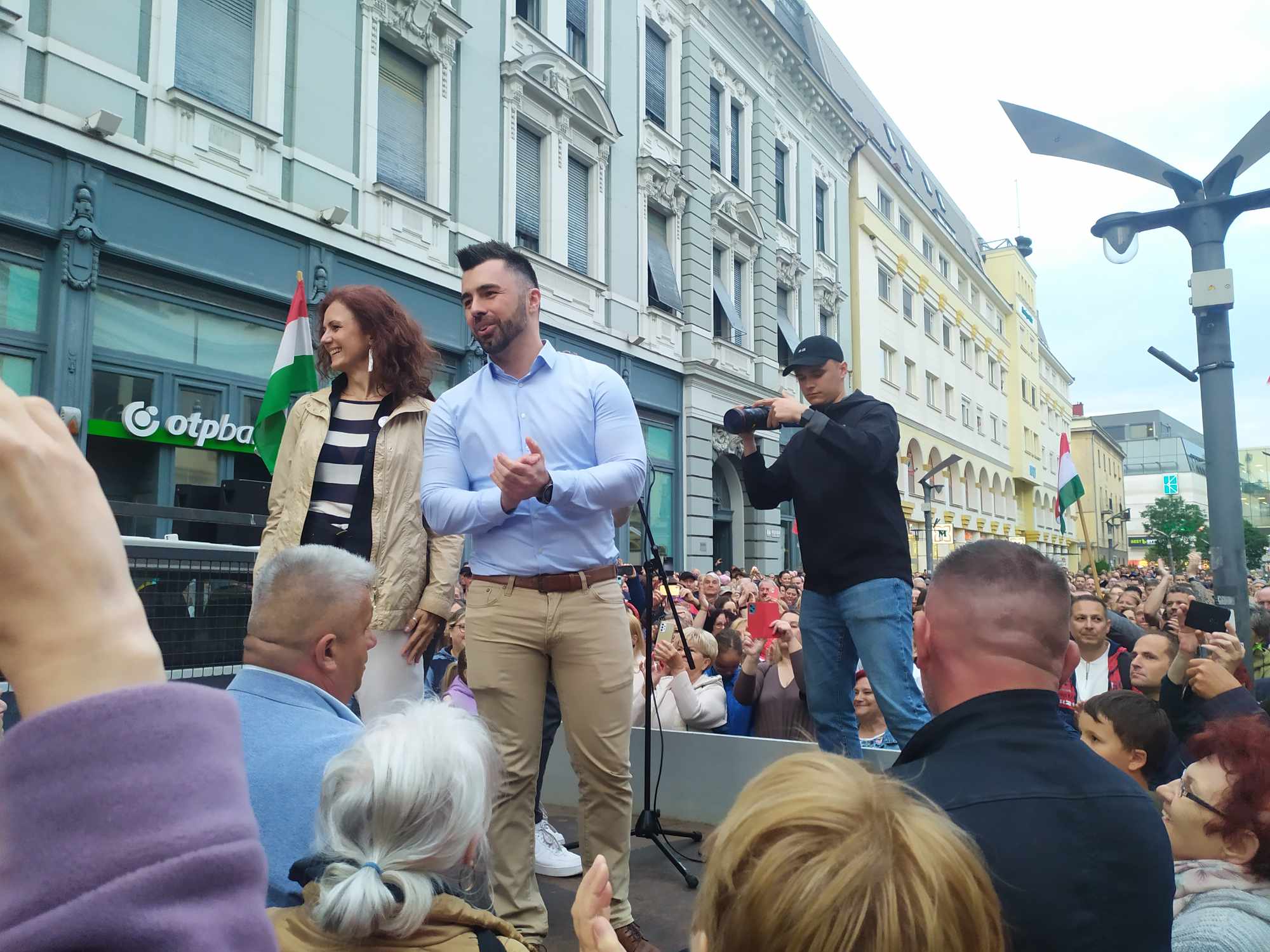 Magyar az “ereszen lemászó, drogos politikusok” helyett közönsége figyelmébe ajánlotta sok nyelven beszélő, hazájukat szerető, felkészült jelöltjeit. Színpadra invitálta a nyíregyházi gyökerekkel is rendelkező, beregszászi születésű Gerzsényi Gabriellát, valamint a sebészorvosként tevékenykedő Kulja Andrást.