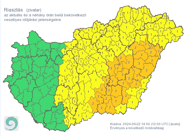 Szombat éjfélig másodfokú figyelmeztetés van érvényben hevesebb zivatarok kialakulásnak veszélye miatt Baranya, Tolna, Bács-Kiskun, Csongrád-Csanád, Békés, Pest, Heves, Jász-Nagykun-Szolnok, Borsod-Abaúj-Zemplén, Hajdú-Bihar és Szabolcs-Szatmár-Bereg vármegye területére.