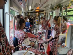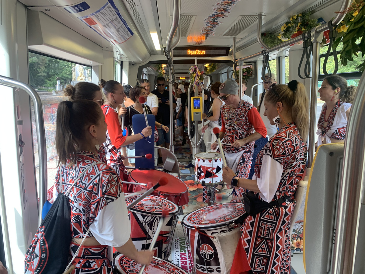 Zenés villamos szállította az utasokat Debrecenben szombat délután, a jó hangulatot a virágkarneválon is látható, Brazíliából érkezett Batala Internacional szolgáltatta.