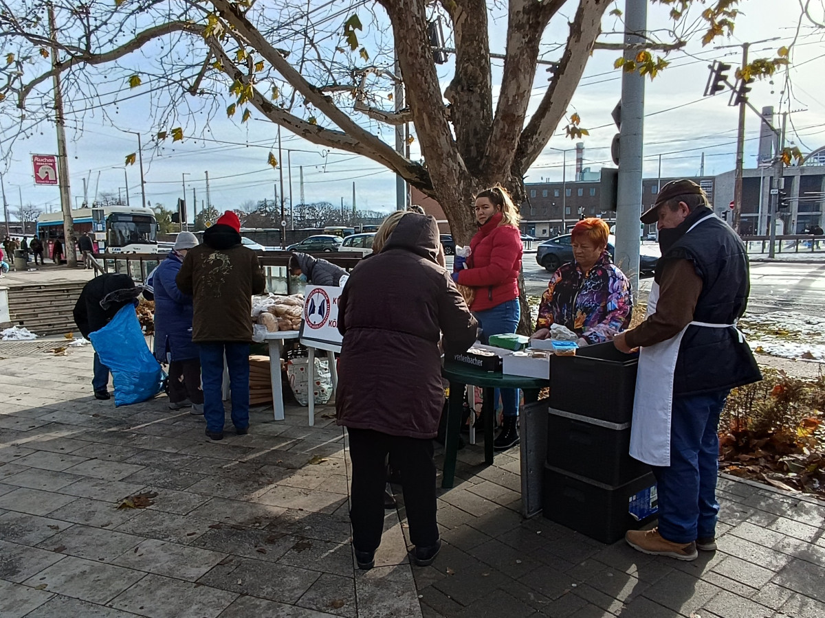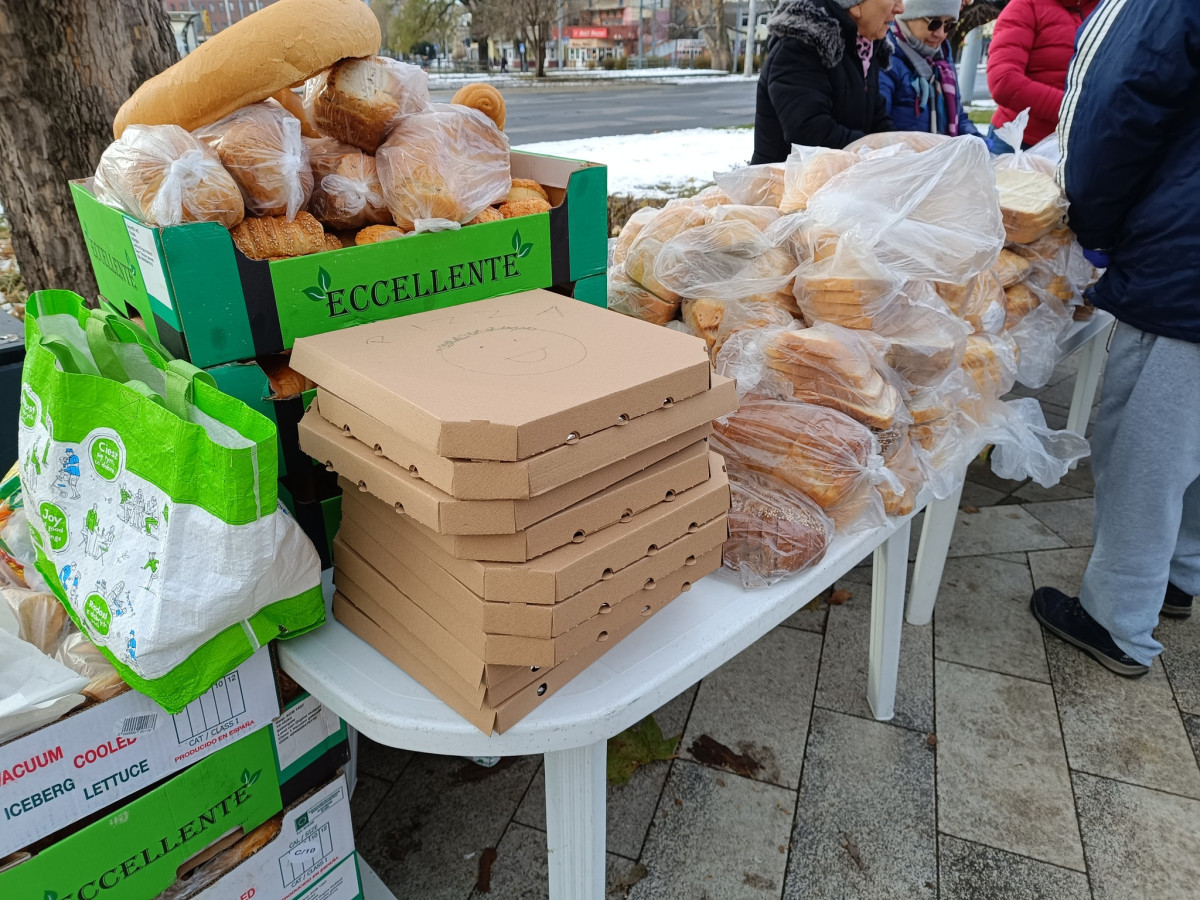 Ezért a hideg ellenére ma is vártuk vendégeinket, ahogy tesszük 2011-óta minden hónap utolsó vasárnapján. Az első vendégek már a kezdés előtt másfél órával megérkeztek. Az ételosztás végére mind a 150 adag töltött káposzta elfogyott. Bőségesen jutott mindenkinek kenyér, péksütemény. Ma ismét adtunk pizzát, és most először muffint is kapott minden vendég.