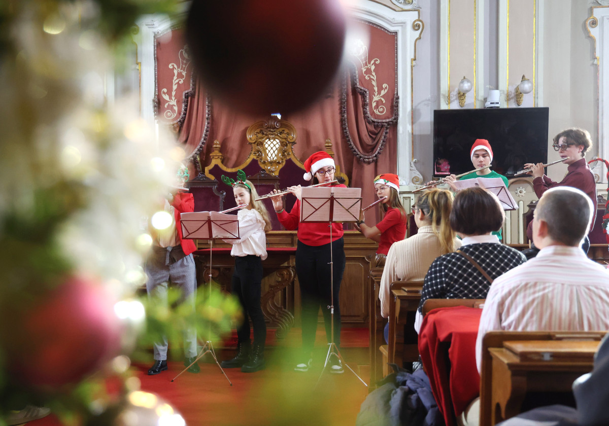 A Király-König Péter Zenei Alapfokú Művészeti Iskola pirosba öltözött, mikulássapkás növendékeinek fuvolaegyüttese egy három darabból álló minikoncertet adott, itt került elő többek között Mozart, valamint Dicsőség mennyben az Istennek is. De hogy az élményt fokozzák, a Bonifert Domonkos Általános Iskola harmadik osztályosai Móra Ferenc meséjét, A didergő királyt adták elő – persze egy kis egyediséget csempészve bele, a versszakok közötti zenebetétekkel színesítve az előadást. Hallhattuk közben Demjén Ferenc Jégszívét – ezt sikerült kiolvasztani –, de mivel „dolgozik a csákány, a fűrész, a balta, a horog”, a Generál együttes Fűrészével könnyű volt érzékeltetni, hogy tényleg jobban megy a munka. Ha nem is játszhatta mindenki a didergő királyt, akkor sem kellett félni, tényleg mindenkinek jutott szerep: udvari bolond, gyümölcsök, királylány, népség, de még ikerablakok is bemutatkoztak – írta meg tudósításában a szeged.hu.