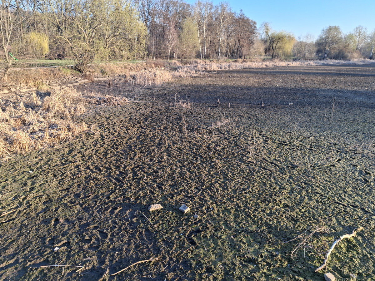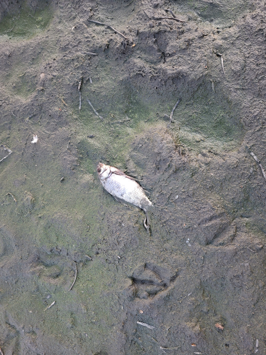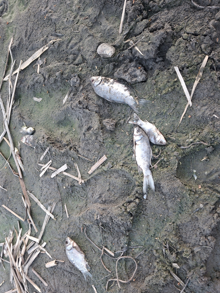 Nos, idén más a helyzet. A víz szinte teljesen eltűnt a mederből. A mutatóban megmaradt pocsolyákban agonizáló halak vergődnek, a víz és iszap bizonytalan határán ezüstkárászok, törpeharcsák (igen, ezek invazív fajok, de szenvedést akkor sem érdemelnek) tetemei és tavi kagylók maradványai jelzik, miféle sors vár itt az élővilág maradékára.