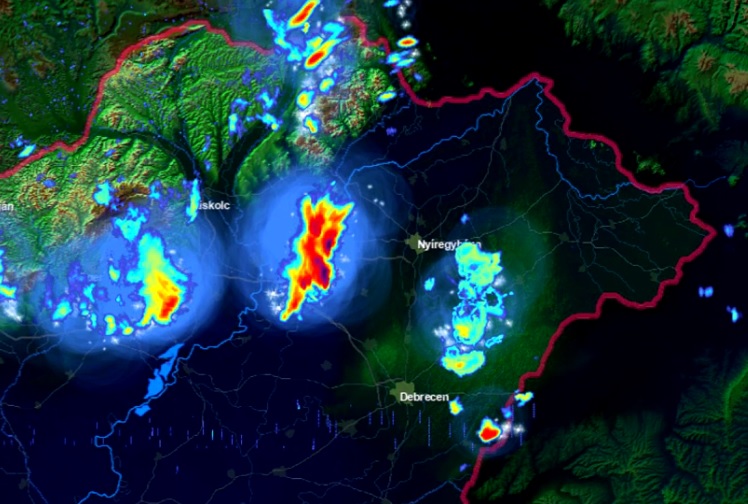 Az Időkép radarján látható, Hajdú-Bihar megyét két irányból is ostromolják a zivatarok. Nyugatról érkezik a nagyobb cella.