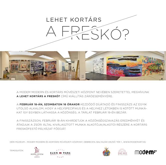 Lezárult a közönségszavazás is (több mint hatezer voks érkezett) a Lehet kortárs a freskó? kiállításon látható munkákra, a zsűri is meghozta döntését. Szeretettel várnak mindenkit a díjátadóval egybekötött finisszázson, ahol kiderül, ki dolgozhat majd tíz napig a MODEM nyitott műtermében, és kinek/kiknek a munkája tetszett leginkább a közönségnek.