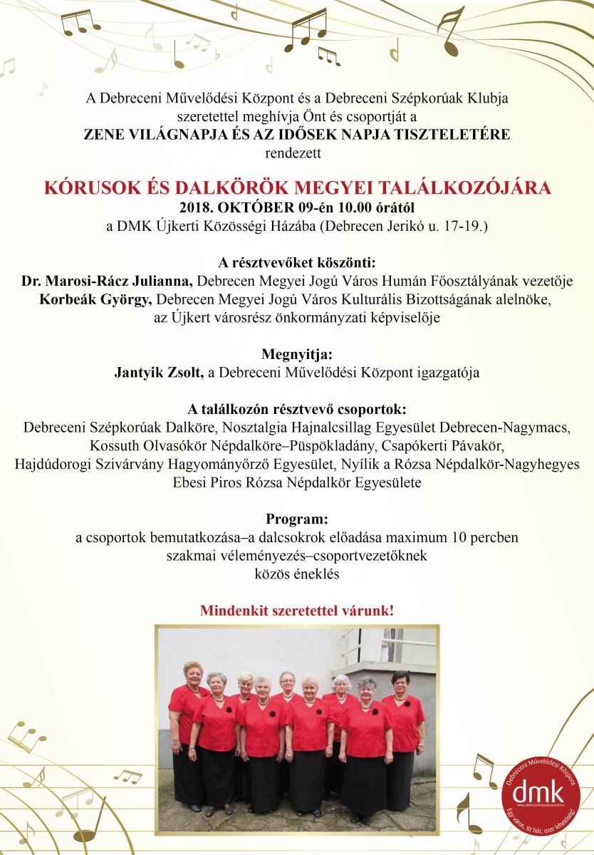 A Debreceni Művelődési Központ és a Debreceni Szépkorúak Klubja a zene világnapja és az idősek napja tiszteletére várja az érdeklődőket a kórusok és dalkörök megyei találkozójára 2018. október09-én 10.00 órától a DMK Újkerti Közösségi Házában (Debrecen Jerikó u. 17-19.).