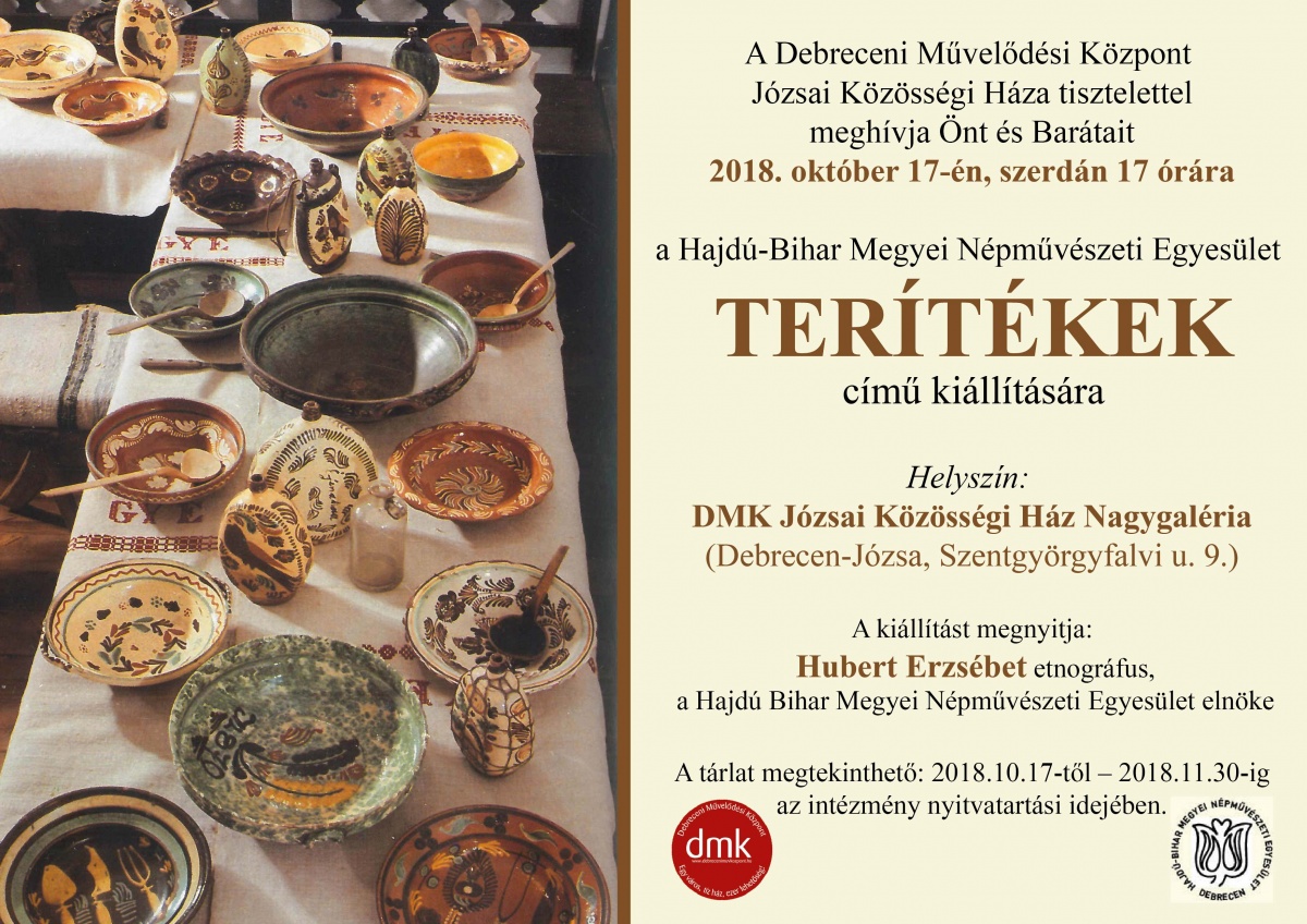 „Terítékek” címmel nyílt kiállítás a Hajdú-Bihar Megyei Népművészeti Egyesület tagjainak munkáiból szeptember 28-án, a Debreceni Művelődési Központ Kismacsi Közösségi Házában.