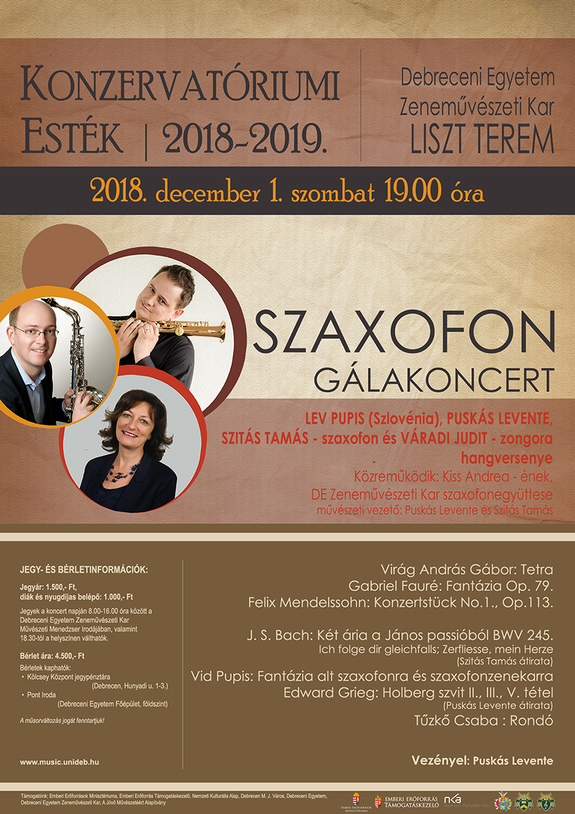 December 1-jén, szombaton 19.00 órakor a Debreceni Egyetem Zeneművészeti Kar Liszt termében a Konzervatóriumi Esték hangversenysorozat vendége Szlovénia egyik kimagasló klasszikus szaxofonművésze, Lev Pupis lesz. A Ljubljanai Zeneakadémia professzora rendkívül sokszínű és sokoldalú előadóművész. Szólistája és egyben alapító tagja a „4SAXESS” kvartettnek, mellyel bejárta egész Európát és az Egyesült Államokat,