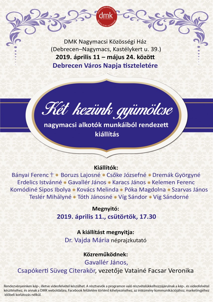 Két kezünk gyümölcse címmel nyílik kiállítás a Nagymacsi Közösségi Házban.A megnyitó április 11-én, 17.30-kor kezdődik, a tárlat megtekinthető 2019. május 24-ig, a közösségi ház nyitvatartási idejében.