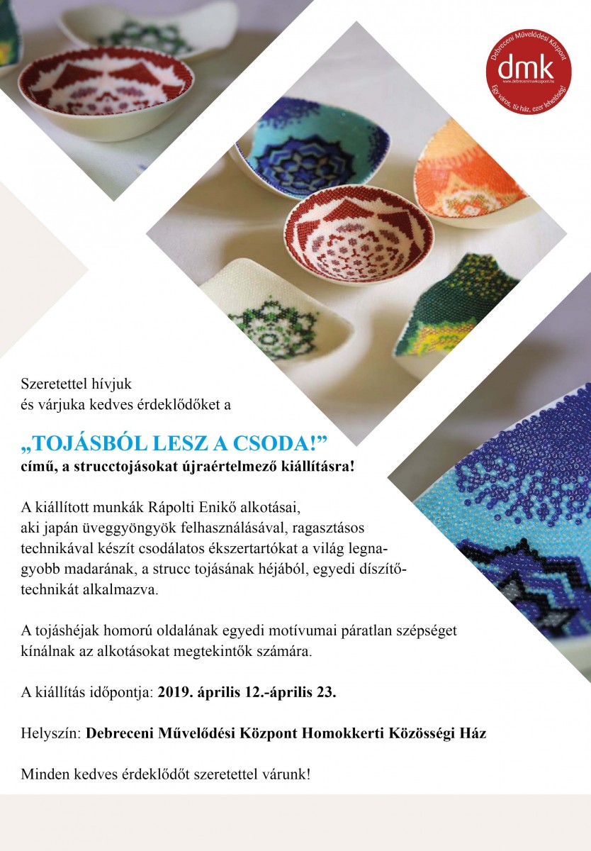 >Április 12-23 között tekinthető meg “Tojásból lesz a csoda!” címmel Rápolti Enikő Strucctojást újraértelmező kiállítása a Homokkerti Közösségi Házban.