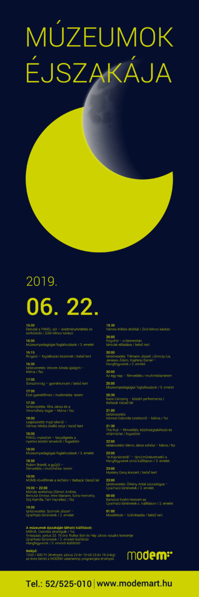 Esti koncert, improvizált színház, kortárs művészet, gyerekprogramok és rendhagyó tárlatvezetések – Vámos Miklós, Momentán társulat, Veiszer Alinda, Örkény Antal, Tilmann József, a Mystery Gang, Barkóczi Noémi, Sokszínvirág zenekar és még sokan mások a MODEM-ben. 2019-ben is különleges programokkal várunk minden művészetkedvelőt június 22-én délutántól egészen másnap hajnalig a Múzeumok Éjszakáján. Sőt, a karszalagok a másnapi Ruttkai Bori-műsorra is érvényesek.