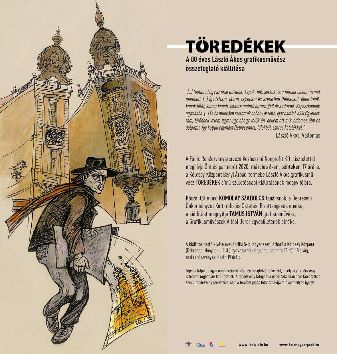 TÖREDÉKEK címmel a 80 éves László Ákos grafikusművész összefoglaló kiállításának megnyitójára kerül sor 2020. március 6-án (pénteken) 17 órától a Kölcsey Központ Bényi Árpád-termében.