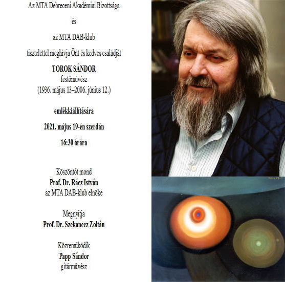 Az MTA Debreceni Akadémiai Bizottsága és az MTA DAB-klub tisztelettel meghív minden érdeklődőt Torok Sándor festőművész (1936. május 13. – 2006. június 12.) emlékkiállítására.