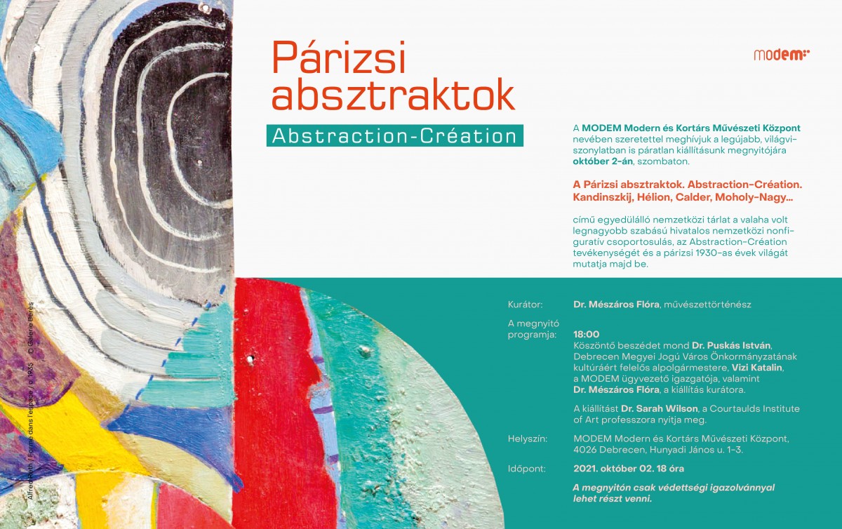 A Párizsi absztraktok. Abstraction-Création. Kandinszkij, Hélion, Calder, Moholy-Nagy… című egyedülálló nemzetközi tárlat a valaha volt legnagyobb szabású hivatalos nemzetközi nonfiguratív csoportosulás, az Abstraction-Création tevékenységét és a párizsi 1930-as évek világát mutatja majd be.