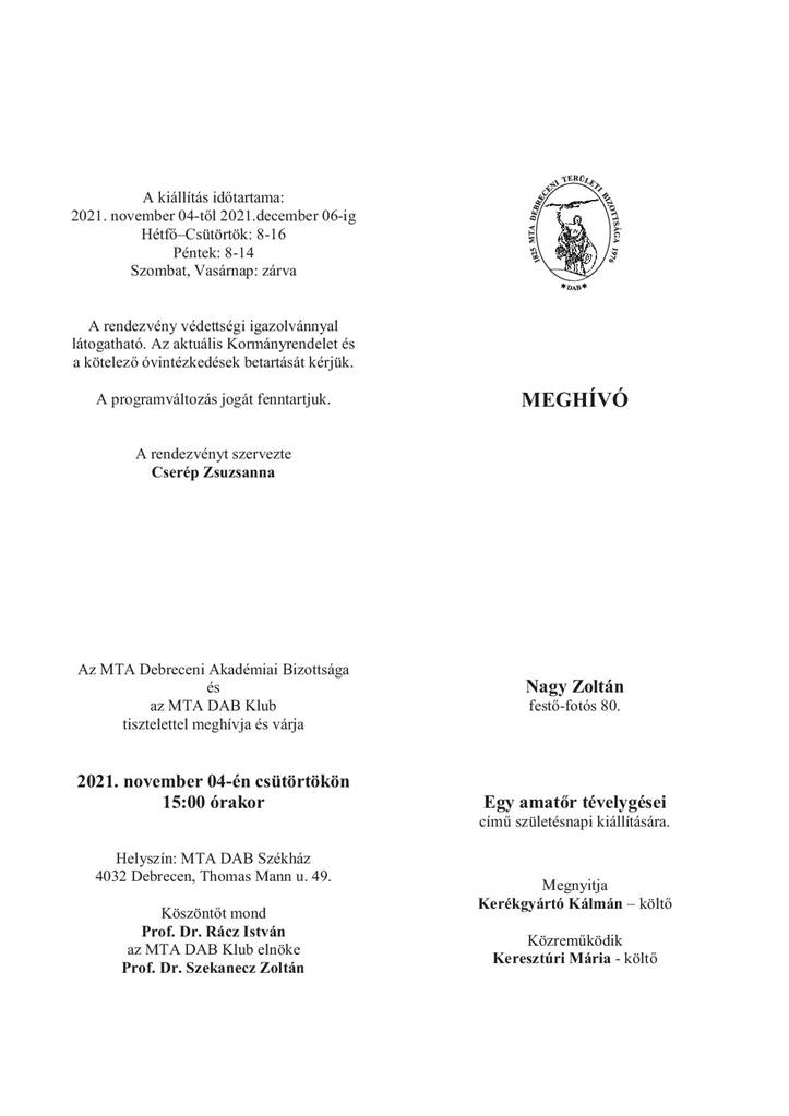 DAB Klub: Nagy Zoltán festő-fotós 80. – Egy amatőr tévelygései Kultúra október 28, 2021Tóháti ZsuzsaSzóljon hozzá a DAB Klub: Nagy Zoltán festő-fotós 80. – Egy amatőr tévelygései bejegyzéshez A rendezvény védettségi igazolvánnyal látogatható.