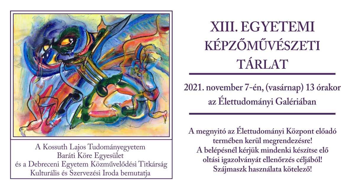 A Kossuth Lajos Tudományegyetem Baráti Köre Egyesület és a Debreceni Egyetem Közművelődési Titkárság Kulturális és Szervezési Iroda bemutatja: XIII. Egyetemi Képzőművészeti Tárlat Debrecenben.