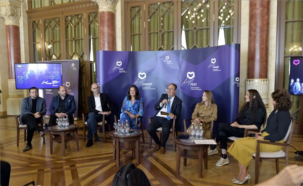 Fotó: Julius Darvas, a Janoska együttes nagybőgőse, Lisztes Jenő cimbalomművész, Fekete-Kovács Kornél zeneszerző, dzsesszzenész, Schöck Atala operaénekesnő, Káel Csaba, a Müpa vezérigazgatója, Barta Dóra koreográfus, Bocskor Bíborka énekesnő és Seres Gerda moderátor (b-j) a Liszt Ünnep Nemzetközi Kulturális Fesztivál program sajtótájékoztatóján a Pesti Vigadóban 2022. szeptember 7-én. Október 7-én kezdődik a Liszt Ünnep Nemzetközi Kulturális Fesztivál, amely október 22-ig klasszikus és kortárs zenei együttműködésekkel, színházi és táncelőadásokkal, ingyenes orgonakoncertekkel, dzsessz- és könnyűzenei formációkkal, irodalmi, valamint képzőművészeti programsorozatokkal és minifesztiválokkal várja a közönséget. MTI/Soós Lajos