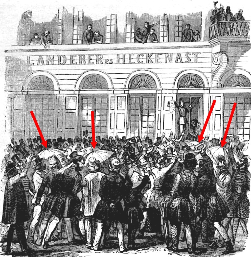 Nyitókép: A szabad sajtó első nyomtatványainak kiosztása 1848 március 15-én Pesten – a nyilak az esernyőkre mutatnak.